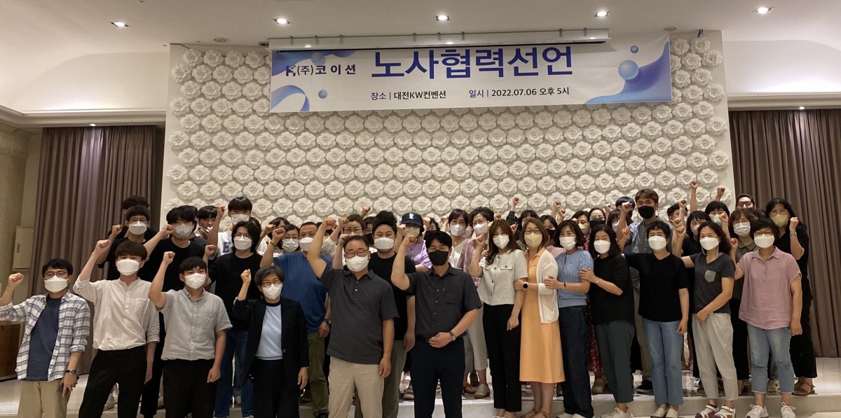 (주)코이션 노사협력선언식 최고관리자 K-NEWS 0 08.19 09:46 2022년도 주식회사 코이션 노사협력선언행사일시 : 2022년 7월 6일 17:00 ~ 20:00장소 : 대전KW컨벤션참석인원 : (주)코이션 임직원 전체 (약70명)