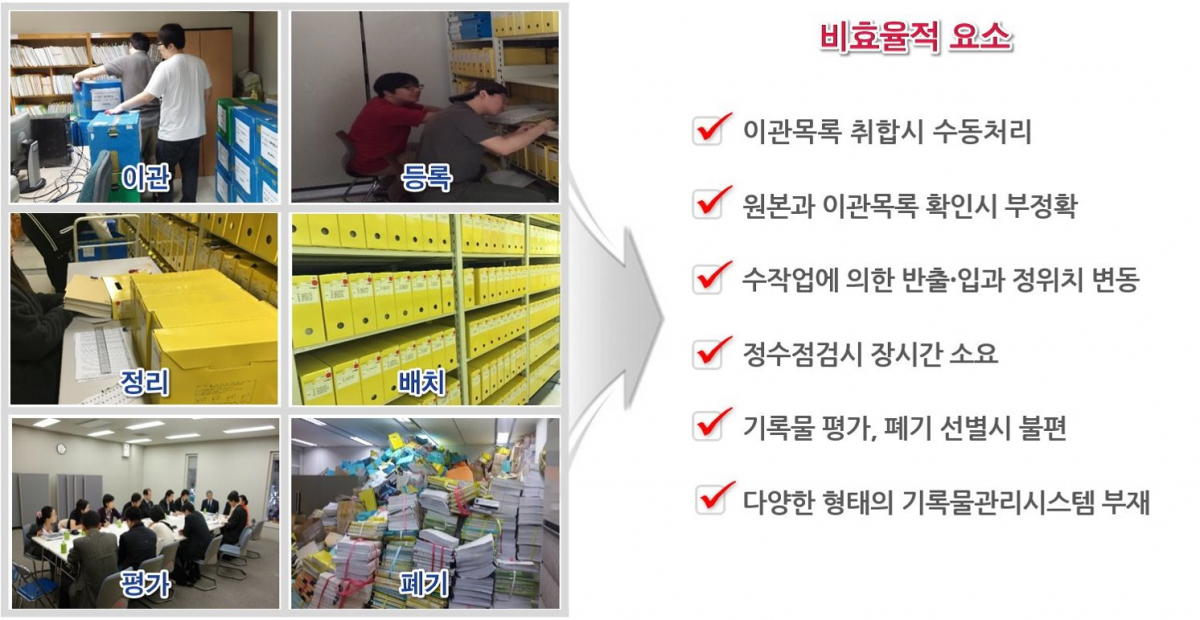 기록관의 변화와 서고관리시스템 최고관리자 K-NEWS 0 08.19 09:51 각 처리과 실 과에서 이관되어 오는 기록물 관리의 문제점을 보완하고 효율적 관리를 위해 비전자문서 및 시청각기록물 관리 시스템 제로트렉이 개발되었습니다.또한, 전자문서의 이미지 관리를 위한 기울기 자동 보정기능 및 사진 문서들의 진위 여부 파악 기능 등 효율적 관리기능이 포함되어 있습니다.